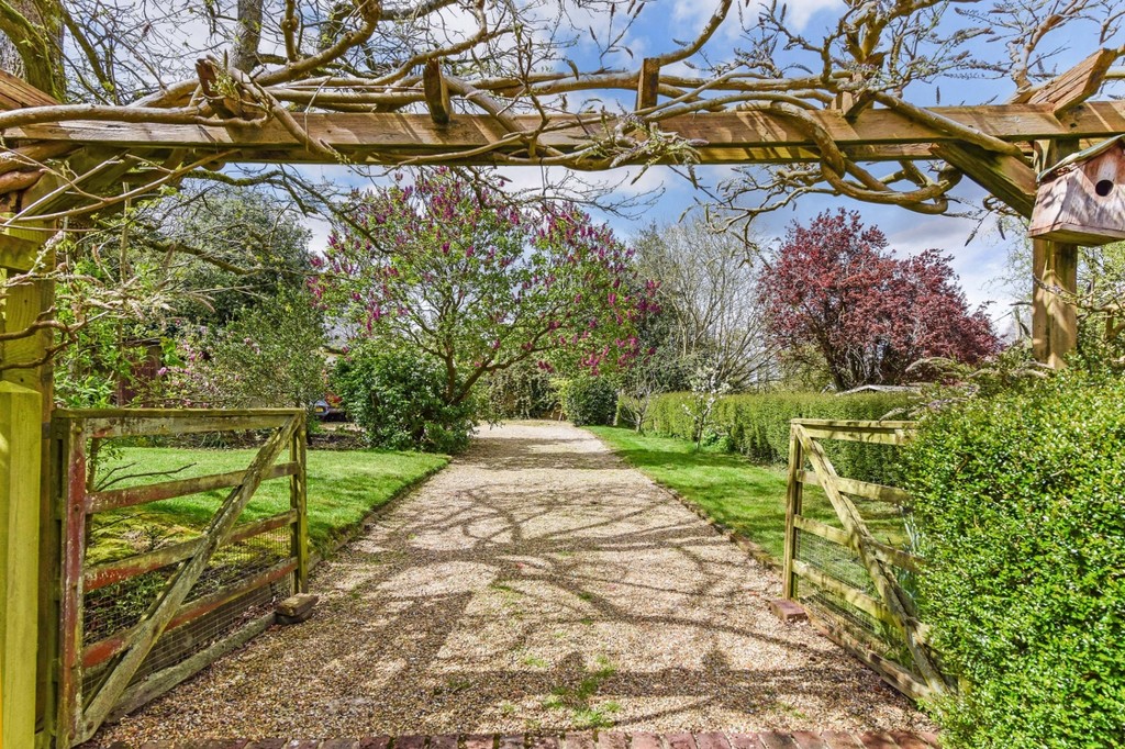 A gravel driveway to the side of the house leads through double gates and a wisteria clad arch to the garden with its mature specimen trees and shrubs, well stocked borders and paved sun terrace.