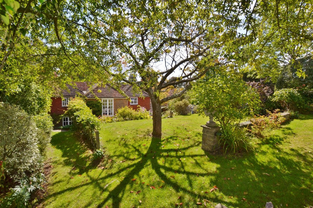 A five bar gate leads to the gravelled drive and onto the parking area in front of the garage. The garden to the front of the house includes a magnificent magnolia tree which shades a paved terrace bordering a lawn and leading into a further enclosed lawned garden with mature shrubs and fruit trees. The beautifully landscaped rear garden is arranged as a series of terraced lawns, each connected by stone steps with adjacent planted borders that offer year-round interest. At the rear of the house there is a wide sun terrace. A kitchen garden and greenhouse can be found on the upper terrace, beyond which, the garden backs onto open farmland, offering distant rural views towards the South Downs.